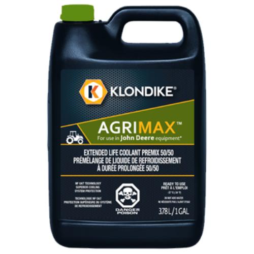 Part Description: 3.78Lt/1gal KLONDIKE AGRIMAX Extended Life Coolant Premix 50/50 is virgin ethylene glycol based premixed engine coolant engineered for use in John Deere heavy duty diesel engine applications. KLONDIKE AGRIMAX Extended Life Coolant Premix 50/50 meets the technical requirements specified by John Deere and is recommended for use in all applications where COOL GARD II is specified.