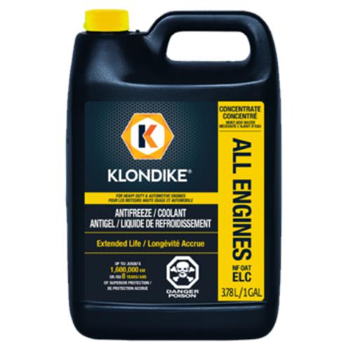 Part Description: 3.78Lt Jug KLONDIKE Gold All Engines NF OAT ELC Antifreeze/ Coolant is highly advanced, virgin ethylene glycol based; multi-purpose, extended life coolant designed for use in ALL heavy and light duty engine applications regardless of year, make, model, or original antifreeze color. KLONDIKE Gold All Engines NF OAT ELC with proven performance chemistry provides antifoam properties as well as outstanding rust and corrosion protection for all cooling system materials such as aluminum, brass, copper, solder, steel and cast iron. Adaptive, robust OAT inhibitor technology ensures maximum service life and full compatibility with other OAT based coolant technologies with no adverse effect making this formulation compatible for use in a vast range of engine applications as a top-up or complete replacement fluid. KLONDIKE Gold All Engines NF OAT ELC Antifreeze/Coolant meets all requirements of ASTM D6210 for heavy duty antifreeze/coolant ensuring maximum protection in heavy duty diesel engines and does not require any additives in servic