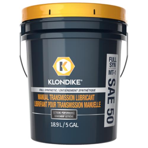 Part Description: 18.9Lt/5gal KLONDIKE Full Synthetic SAE 50 Manual Transmission Lubricant is a heavy duty transmission fluid specially formulated for extended drain applications and severe operating conditions. KLONDIKE Full Synthetic SAE 50 Manual Transmission Lubricant is recommended for service fill of heavy duty manual transmissions. Typical applications include on-highway heavy duty trucks and buses as well as off-highway heavy equipment in the forestry, construction and mining industries. The ideal manual transmission fluid to complement the use of full synthetic gear lubricants in rear differentials and axles, thus offering outstanding service life and fuel economy benefits. KLONDIKE Full Synthetic SAE 50 Manual Transmission Lubricant’s low pour point and high viscosity index impart excellent lubrication protection during startup in extreme cold conditions, while also providing outstanding performance characteristics and excellent lubricant film strength across a wide temperature range. Optimized oil viscosity with low coefficient of friction can lead to reduced operating temperature and improved fuel economy as compared to conventional mineral-based lubricants.